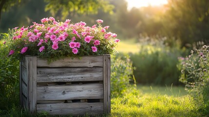 Pink Flowers in Rustic Wooden Planter Box Summer Garden