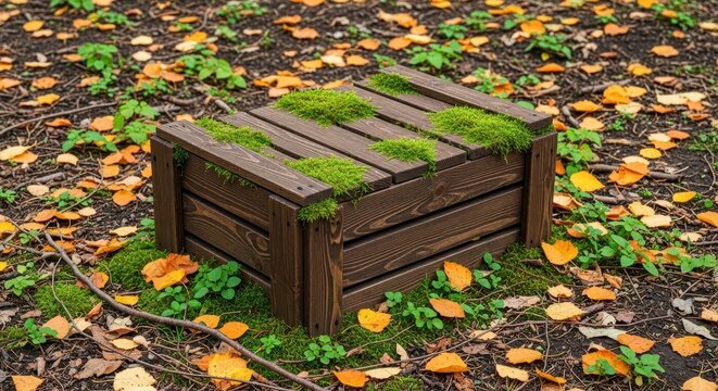 Wooden Garden Planter Box with Moss and Autumn Leaves