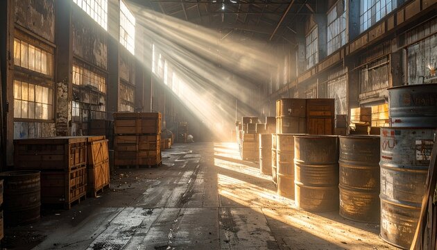 Sunlight streaming through dusty windows in an abandoned warehouse filled with wooden crates and barrels