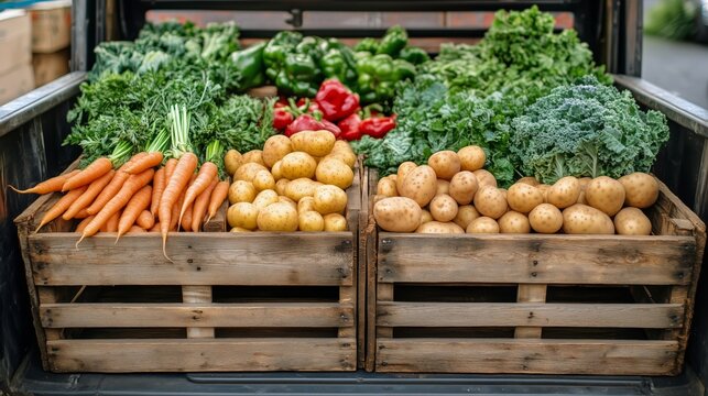 Fresh Vegetables Displayed in Wooden Crates at a Local Market During the Afternoon