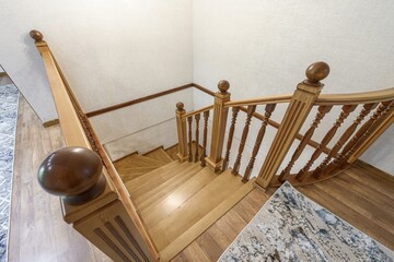 high-angle shot of a wooden staircase with decorative railings and spherical finials. Natural light illuminates the clean, minimalist interior design