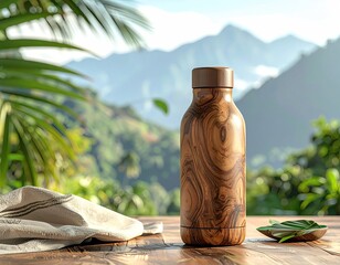 A wooden bottle sits on a table overlooking a lush, mountainous vista