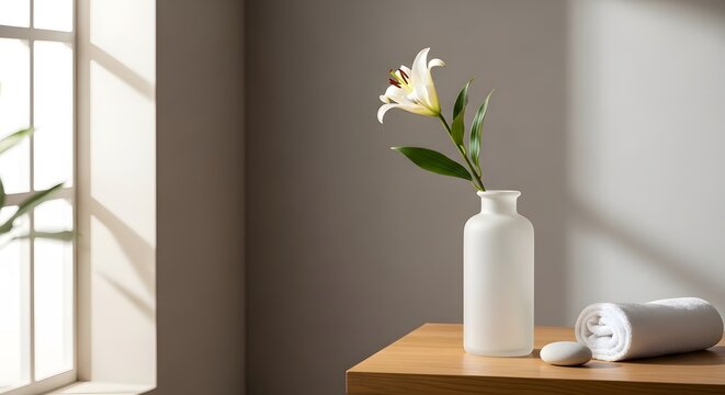 Photo of elegant white lily in a minimalist vase on a wooden table, bathed in soft sunlight from a window