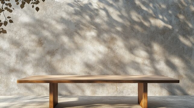 Minimalist Wooden Table Against Rustic Textured Wall and Shadow Play