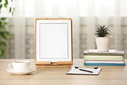 Mock up of digital tablet blank screen template stand on wooden tabletop, 3d rendering