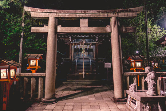 Girl and rabbit statue, stone torii gate and little shinto altar with bell and wooden lamps at Yasaka shrine in night, Kyoto, Japan