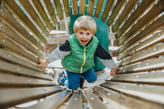Little boy crawling through wooden pipe or tunnel on playground at park. Active childhood, healthy lifestyle, kids playing outdoors, children in nature