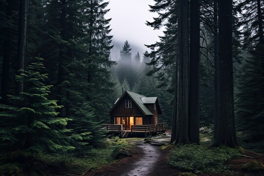 Wooden hut in the forest at foggy day, California, USA, AI Generated