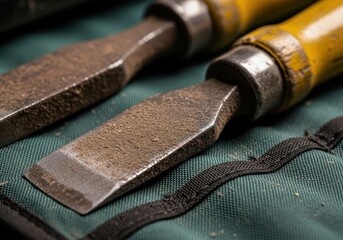 Closeup of two wellused chisels with yellow handles, resting on a green fabric surface