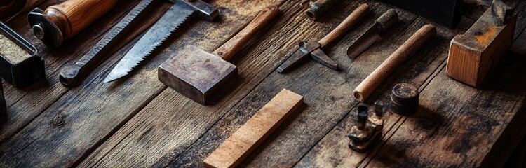 Vintage woodworking tools on rustic workbench