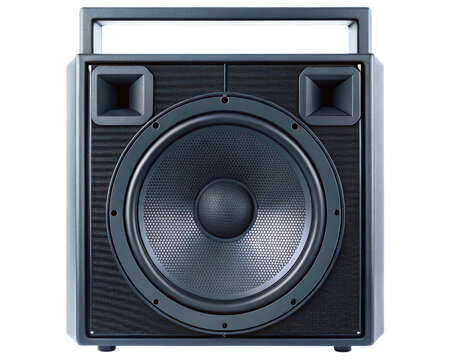 Portable public address system speaker with a large woofer and handle on a transparent background