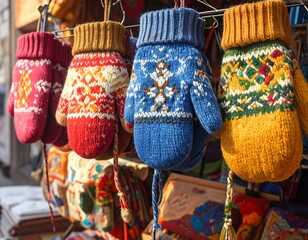 Colorful knitted wool mittens hanging in a market stall on a winter day