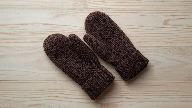 A pair of wool mittens in soft beige, with a subtle knitted pattern, lying neatly on a rustic wooden table with scattered pinecones, a sprig of evergreen, and a warm glow from sunlight.