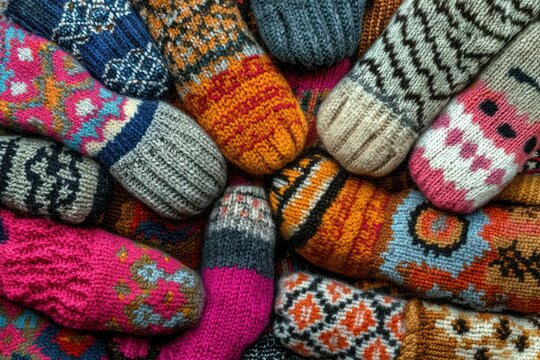 Colorful handmade traditional mittens in the street market in Europe. Original souvenirs from the trip. Travel gift. Crafts for sale. Comfortable style cloth. Riga, Latvia.