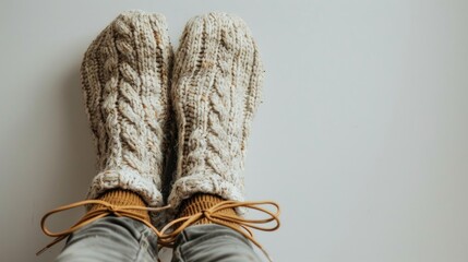 Legs in woolen socks against a white backdrop Cozy winter footwear crafted by hand