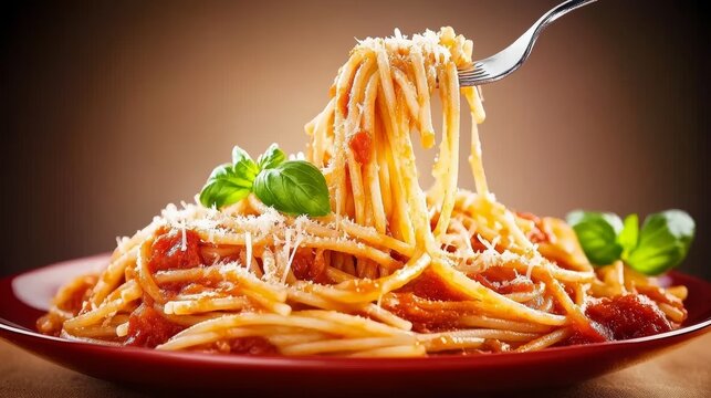 Un plato de espaguetis al dente con salsa de tomate y albahaca fresca, enrollado en un tenedor. La imagen es perfecta para mostrar la autenticidad de la cocina italiana.