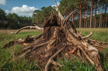 Artistic nature photo showing numerous wood ants constructing a fresh nest mound beneath a toppled pine tree in a heathland area.