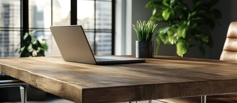Close up of an office workspace featuring a wooden table with a laptop showcasing a comfortable area for work There is copy space available for adding text