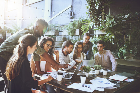 Smiling business people at meeting. Group of colleagues work together. Brainstorming successful solutions at office. Team collaboration concept with green plant on foreground for eco company. Diverse