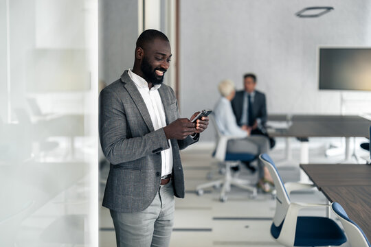 Smiling man using smartphone in tech-savvy office