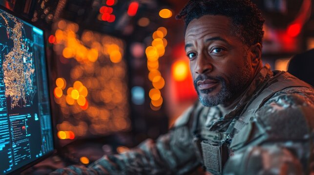 Veteran participating in a virtual meeting at home, engaged and focused on the discussion