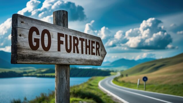 Wooden sign saying Go Further with a scenic background.