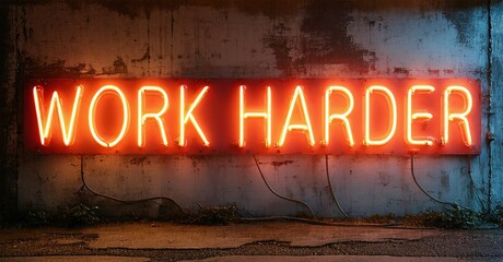 Bright neon sign displays WORK HARDER against textured wall. Dark background emphasizes glowing letters, creating dramatic effect.