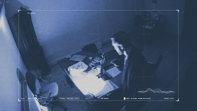 Company worker covertly examines business papers in a dark office, involved in espionage