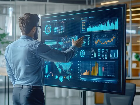 An office scene featuring a professional employee standing in front of a large digital screen