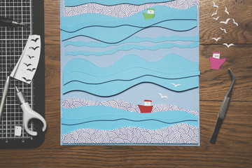Man's hands using computer mouse and keyboard on desk; top perspective. Light blue shirt, workplace scene