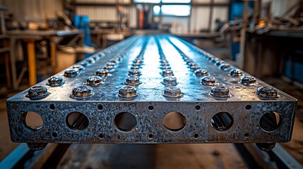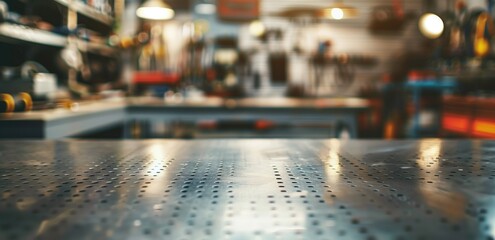 Clean metal workbench surface in a bright workshop with blurred tools and window light creating a sense of productivity and craftsmanship for industrial applications