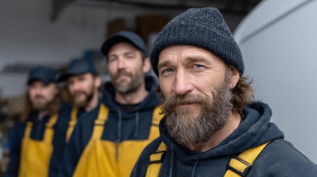 Five workers wearing matching yellow aprons and black hats pose in a warehouse. They show a sense of camaraderie and professionalism, highlighting teamwork during their workday