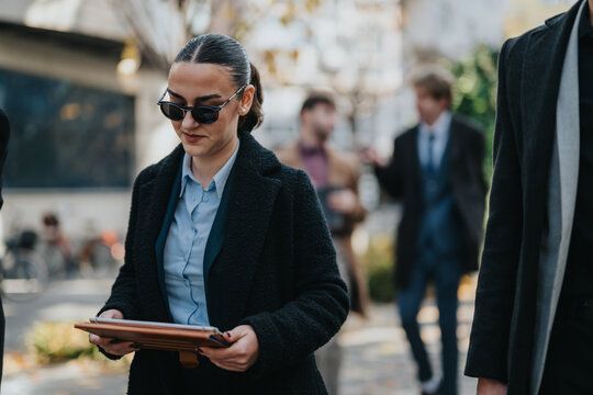 A stylish professional woman wearing sunglasses and a dark coat carries a tablet while walking on a city street. Busy colleagues in the background suggest a dynamic, modern workday environment.