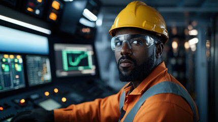 Engineer wearing safety gear, focused on control panel in industrial setting