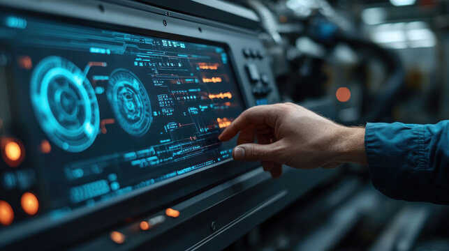 In a dimly lit factory setting, an industrial engineer uses a futuristic touchscreen control panel to manage and monitor the production process, ensuring smooth and efficient operations
