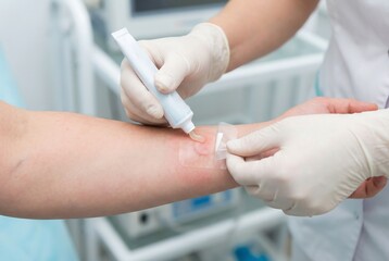 Medical worker applying gel from tube to caucasian woman arm. Healthcare treatment, wound care, or IV preparation. Hospital medical procedure.