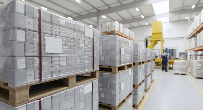 organized warehouse with neatly stacked pallets, forklifts operating, professional logistics environment
