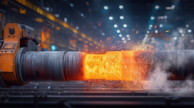 Bright Orange Molten Metal in Industrial Steel Processing with Sparks Flying and Machinery in Action