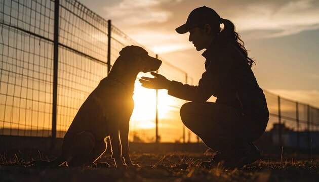 Woman's silhouette fostering connection with a rescued dog at sunset sanctuary