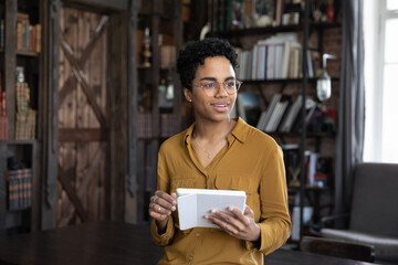 Thoughtful positive Black gadget user woman lost in thoughts, using tablet computer at home, thinking over business tasks, issues solving, making online payments, using internet service
