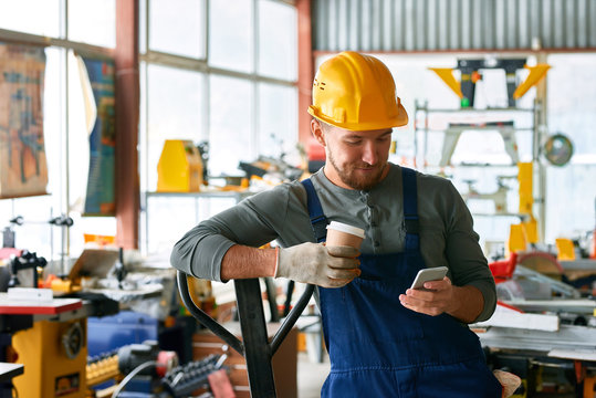 Portrait of young bearded worker taking break in factory workshop: using smartphone and smiling happily holding coffee cup