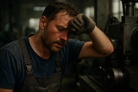 Tired industrial worker taking a break from operating machinery, suffering from heat and fatigue in metalworking industry