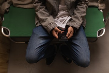 Young handsome blacksmith man sitting in front of the workbench, resting and using smartphone