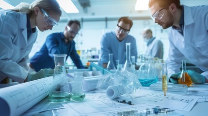 Engineers and scientists collaborate on a chemical waste recycling project, reviewing blueprints and models.