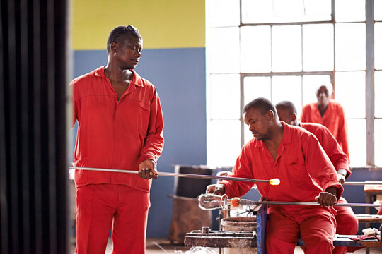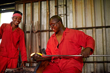 Men, worker and glassblower in glass factory for manufacturing, production process and industry. Glassware, craft and tools to shape for art, recycling and African group with blowpipe for welding