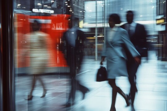 Blurred motion of business professionals walking briskly through a modern glass building, capturing the hustle and bustle of city life.