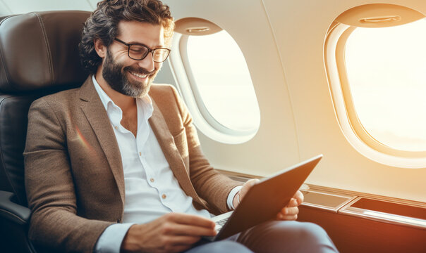 Smiling happy businessman flying and working in an airplane in first class, Man  sitting inside an airplane using laptop.