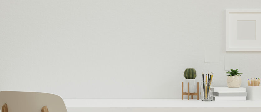 Breakfast still life. Cup of coffee, books and empty picture frame mockup on wooden desk, table. Vase with olive branches. Elegant working space, home office concept. Scandinavian interior design.