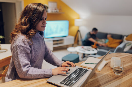 Woman engaging in remote work at home desk, focused environment