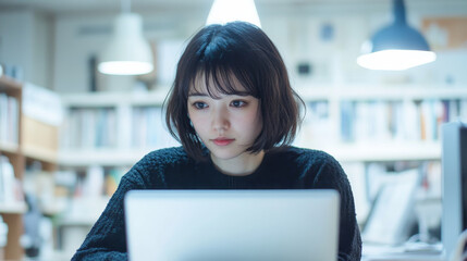 Young Japanese woman hard working in front of a laptop computer in open space office